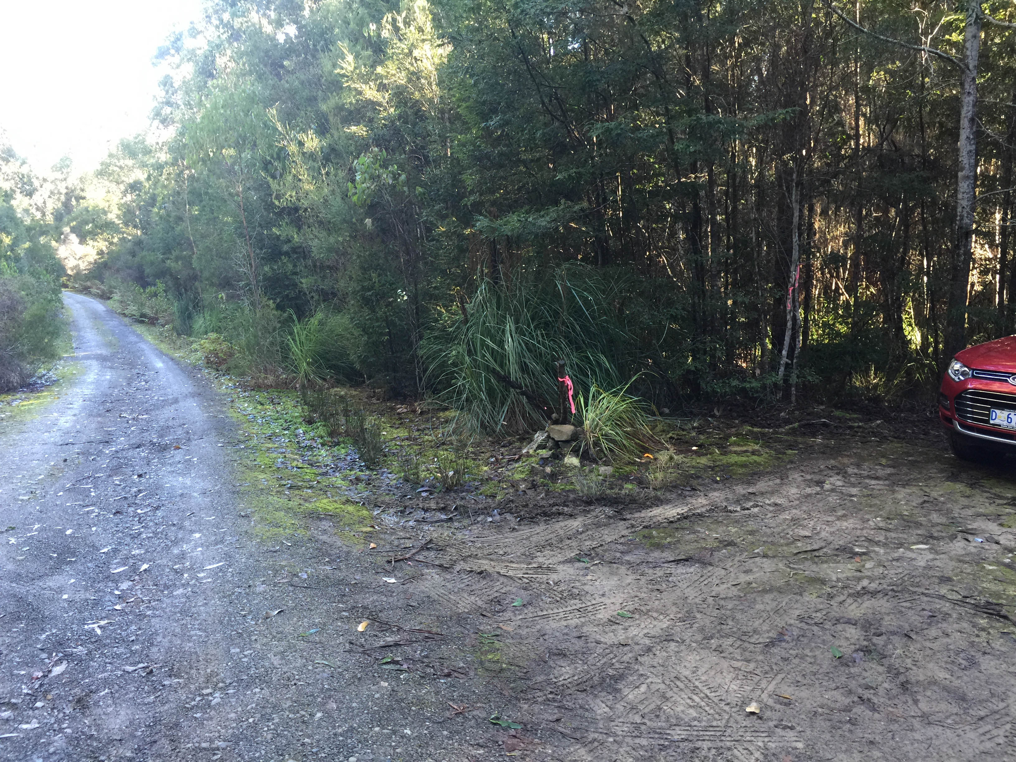 McGowans Falls is a large tiered waterfall situated on Relapse Creek, west of West Takone in Tasmania.  Access to McGowans Falls is from Relapse Creek Road, a Forestry Rd that branches off Farquhars Road. There is no signage in the area to indicate where the waterfall is, nor are there street signs to indicate where each road is.  Being forestry roads, the tracks are unsealed gravel roads, suffering from some very large potholes. We recommend an SUV vehicle, or a 4WD be used if you wish to visit these falls, and surrounding area. Caravans, and motorhomes should avoid the area entirely. A makeshift area has been created by hiking enthusiasts for car parking that could accommodate 2 vehicles parked one in front of the other, with a pink ribbon on a stick marking the spot to park.