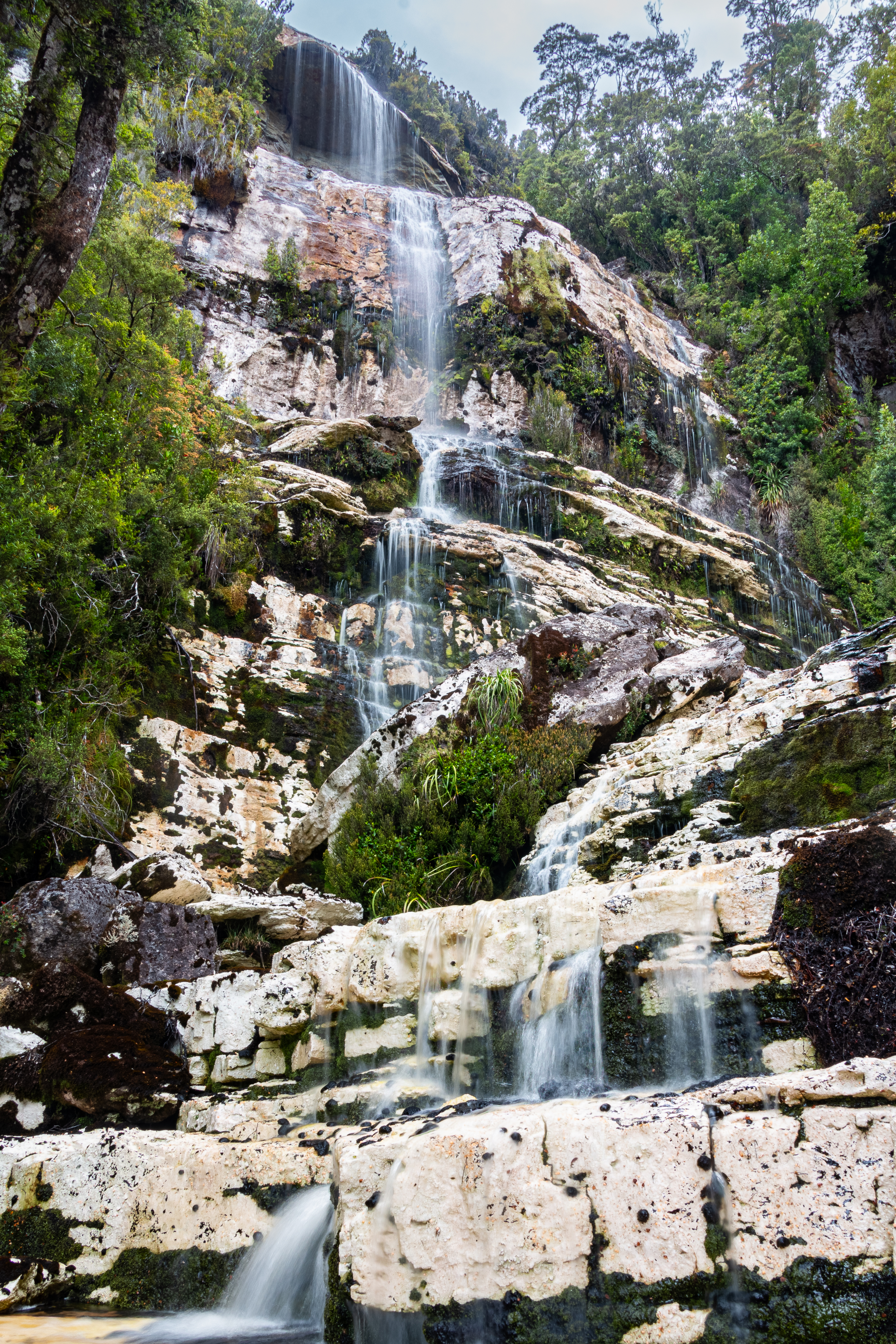 The remote Moonlight Creek in Southwest National Park features a pair of impressive unnamed waterfall features in its upper reaches on Moonlight Ridge. The first of these falls is Moonlight Cascades, which drop about 10 metres over a series of ledges, which can be viewed from several levels including the base.