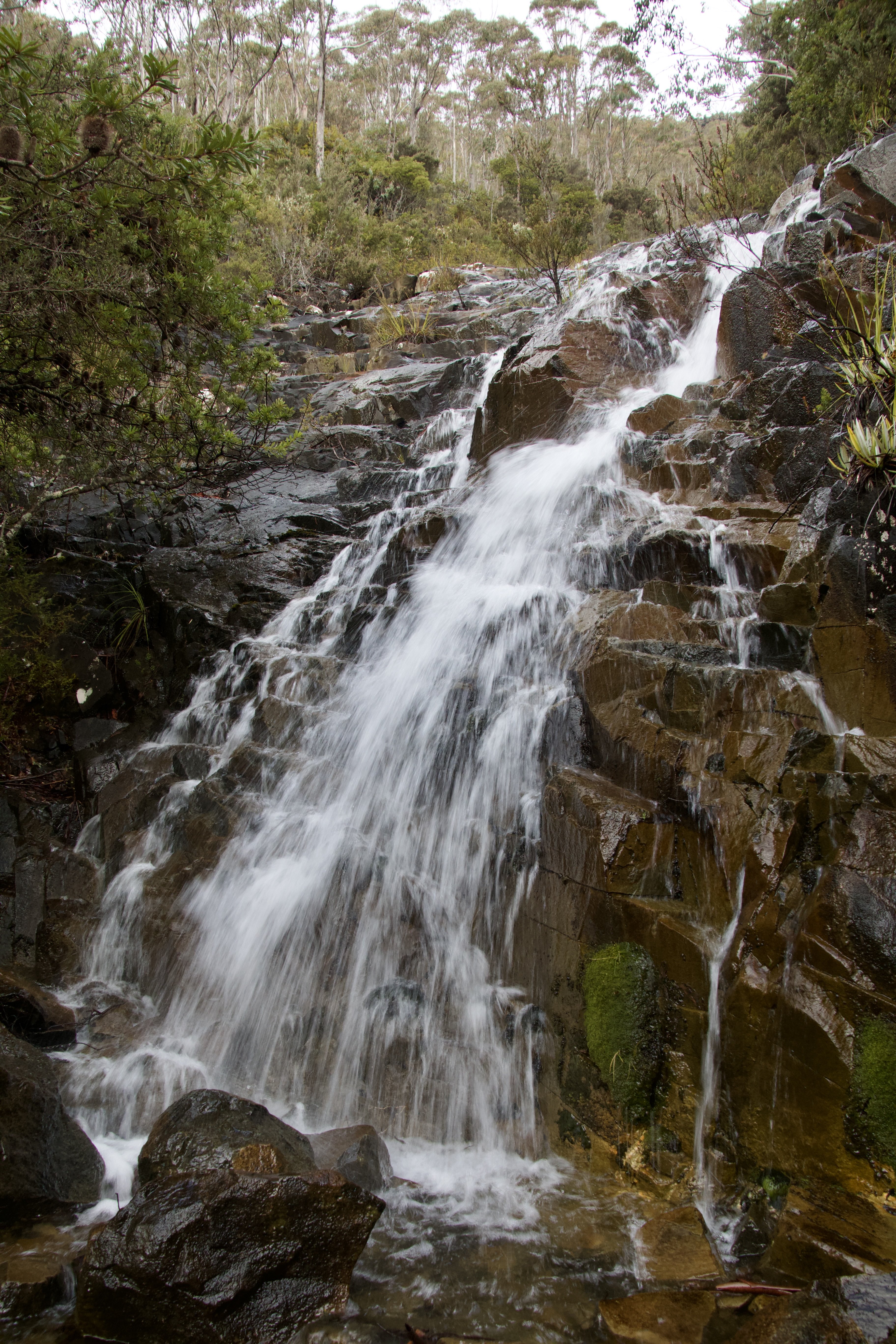 On the foothills of Mt. Wellington, New Town Falls is a multi-tiered waterfall that can be accessed from the Lenah Valley Track. The track will guide you to an upper tier of the waterfall (pictured). A larger tier of New Town Falls is slightly downstream, but cannot be seen due to the dense forest and the steepness of the area.